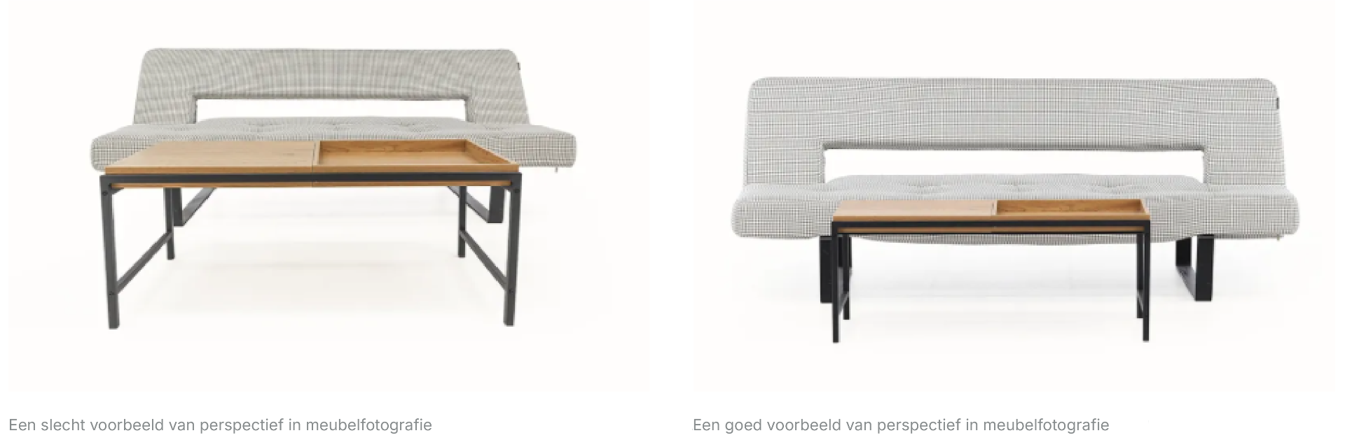 Het hele meubelstuk wordt zonder vervorming gefotografeerd door de camera verder weg te plaatsen en een standaard- tot telelens te gebruiken. Dit is vooral belangrijk bij grotere meubels.